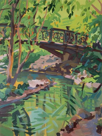 Contemporary painter Sarah Lorentz [American, 1994 - present] creates energetic, striking compositions full of bold brushwork and electric color while tapping into the nostalgia of her 1990's childhood. Though the subject matter of her work ranges from evocative figurative commentaries to pastoral plein air landscapes, the physicality of material and deliberate remnants of the process reveal the same confident hand behind the brush.